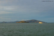 By 1600 hrs, we started to our next destination – the Fisherman’s Wharf. We reached the place in 30 minutes, but finding free parking was a task so we went ahead with a paid parking lot. The moment you start walking on the streets at Fisherman’s Wharf, you would see a lot of crab & shrimp dishes for a quick bite. We did enjoy share by gorging on crab rolls! We soon found ourselves standing in a line to board a sunset cruise we booked with Red and White Fleet. With around 15 minutes to board, a Heermann’s Gull – lifer #4, came and perched around 12 feet away. Now if I had my 400mm lens on the camera, it would have been a perfect opportunity to make a bird portrait in the fading golden light however seeing most of gulls are pretty bold, I decided to stick with the 24mm lens try a wide angle shot. Approaching it cautiously I was able to close in on this bold Heermann’s Gull in its breeding plumage & I framed the shot I noticed the famous Alcatraz island in the background. I actually stepped back a bit to frame it with the island giving the following result. Surely one of my favourite images from the trip 🙂